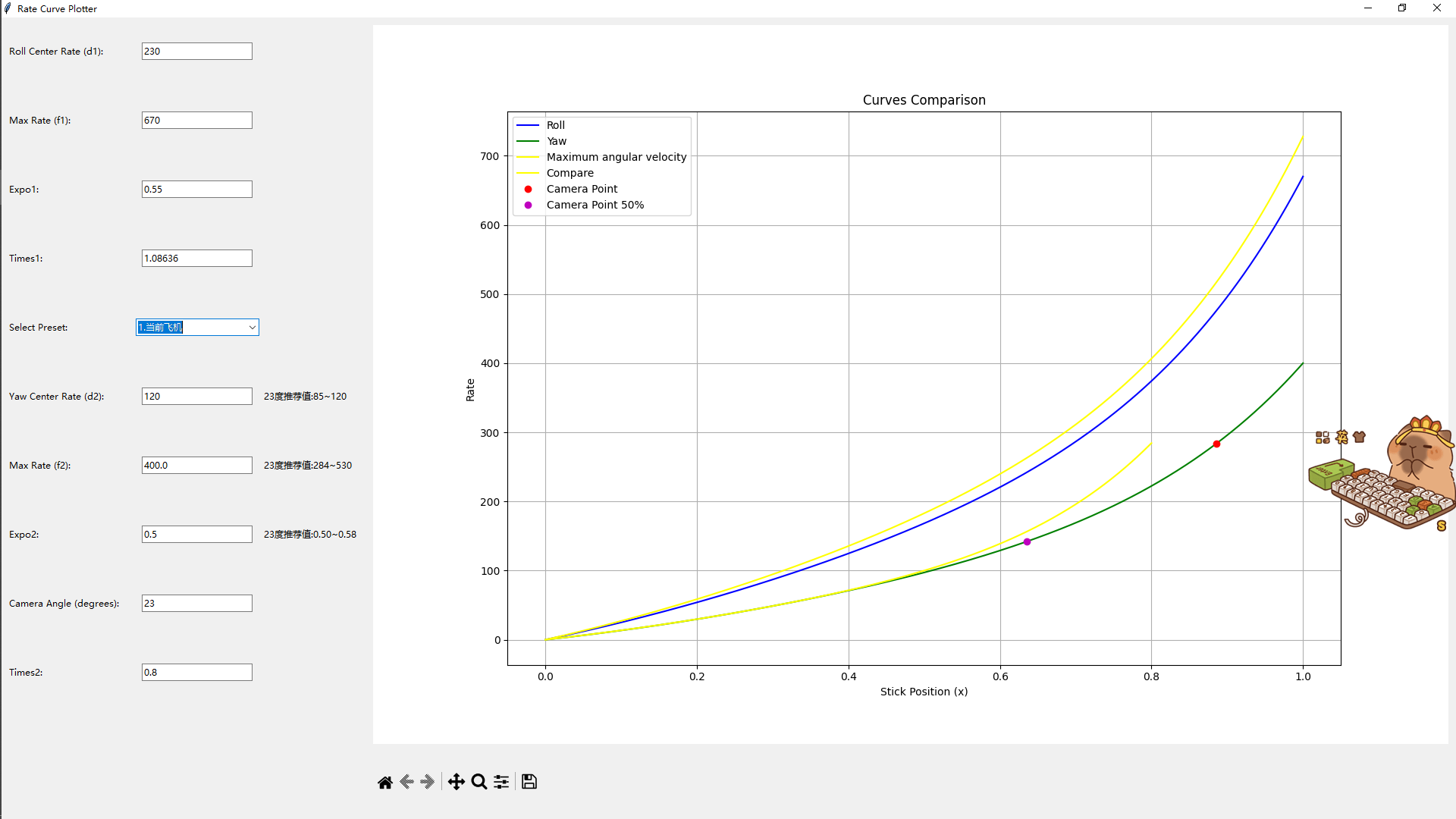 2.我需要借助最大角速度极值点均摊一些到60~80段位,所以roll的expo由0.57减小到0.55.注意,当times2为1的时候,调试roll和yaw的expo会是相等的。保持曲线在同样的位置(50%或者55%)进行明显的弯曲。